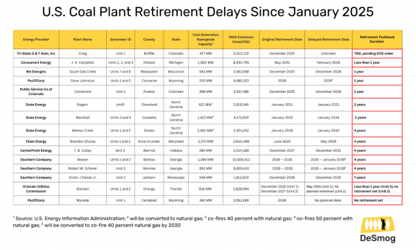 DeSmog identified the 15 plants by examining changes to the planned retirement dates listed by the U.S. Energy Information Administration (EIA), a DOE agency that compiles data on energy providers, as well as public statements from utilities and the Trump administration. Some of the voluntary delays appear to directly contradict previous net-zero pledges made by several companies.