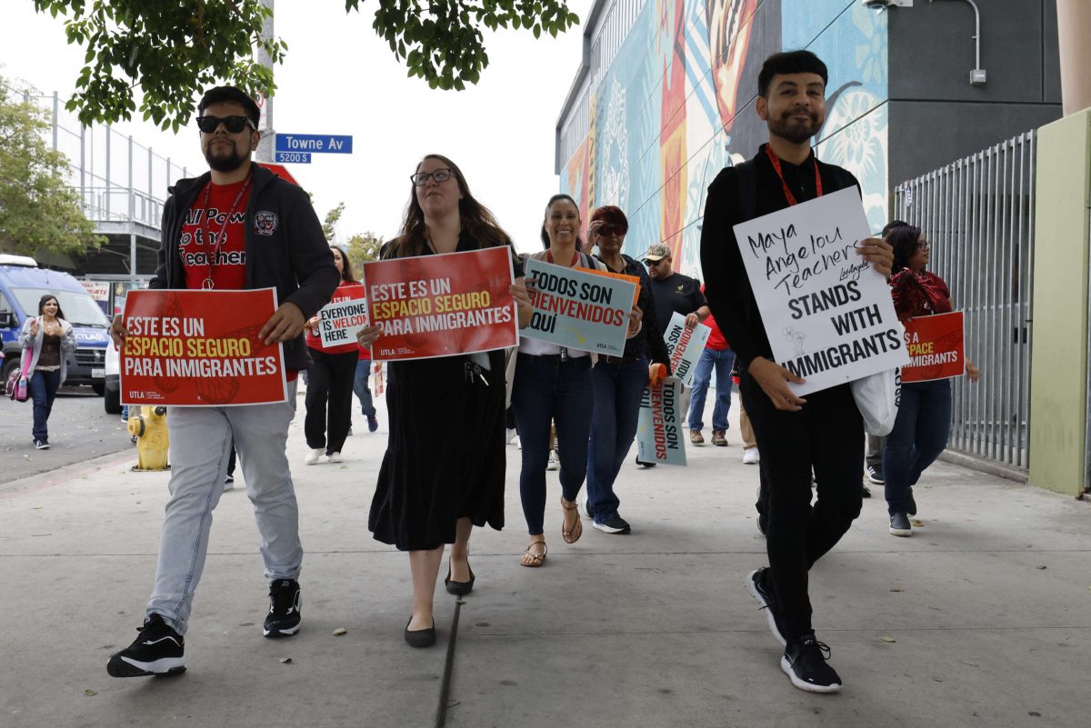 Above photo: Community organizations and teachers rally outside for immigrant rights on the first day of school at Maya Angelou High School on Thursday, August 14, 2025, in Los Angeles, California. Carlin Stiehl / Los Angeles Times via Getty Images.