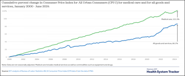 The rising cost of medical care, which includes medical procedures, nursing-home services, insurance, drugs, and medical equipment, has long outpaced general inflation. Currently, health care spending represents about 18 percent of the U.S. economy, meaning that roughly one out of every five dollars spent goes toward health care costs — more than what Americans spend on groceries or housing. In 1960, it was only 5 percent.