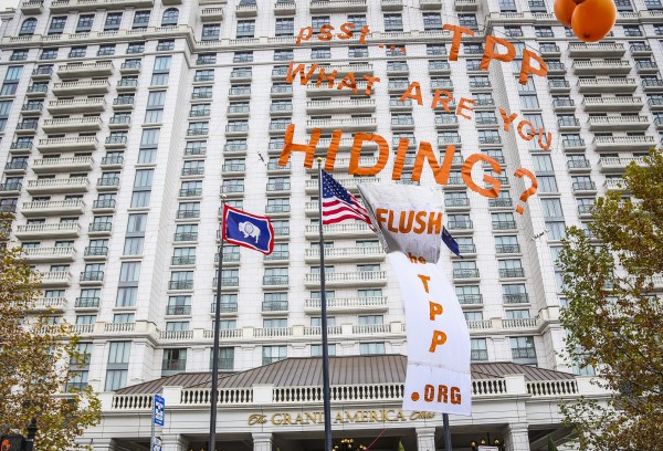Above: Protest in Salt Lake City outside of the hotel where TPP negotiators were meeting. Sign says “Psst . . . TPP What are you hiding?”