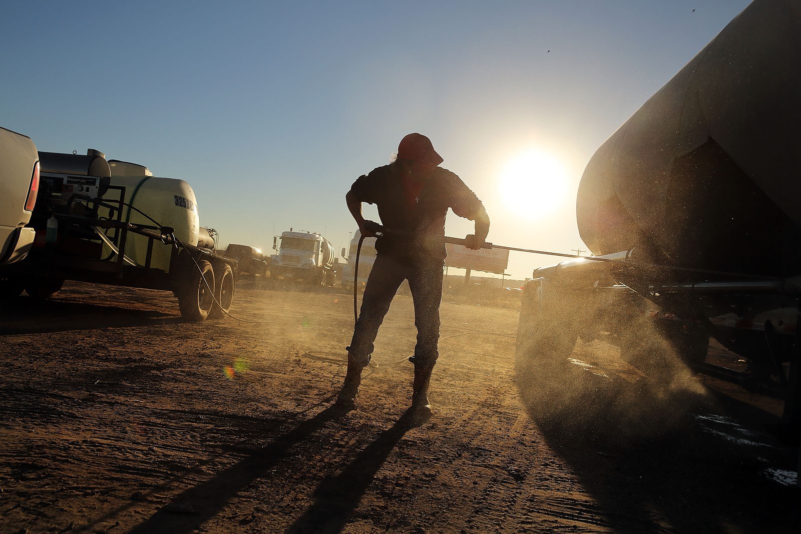 Above photo: A driver transporting frac sand washes his truck at a truck stop on February 4, 2015 in Odessa, Texas. Spencer Platt/Getty Images.