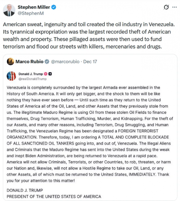 Trump declared an illegal naval blockade of Venezuela on December 16. The US government aims to prevent Venezuela from selling oil to China, to starve Caracas of export revenue.