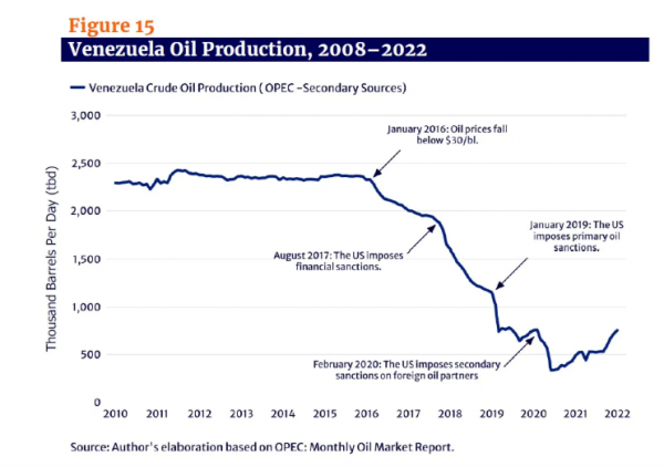 As the US government steadily increased the number of illegal sanctions, Venezuela’s oil production crashed. The South American nation not only found it difficult to export its crude, but it was unable to import the technologies, parts, and products needed to repair and modernize its oil infrastructure.
