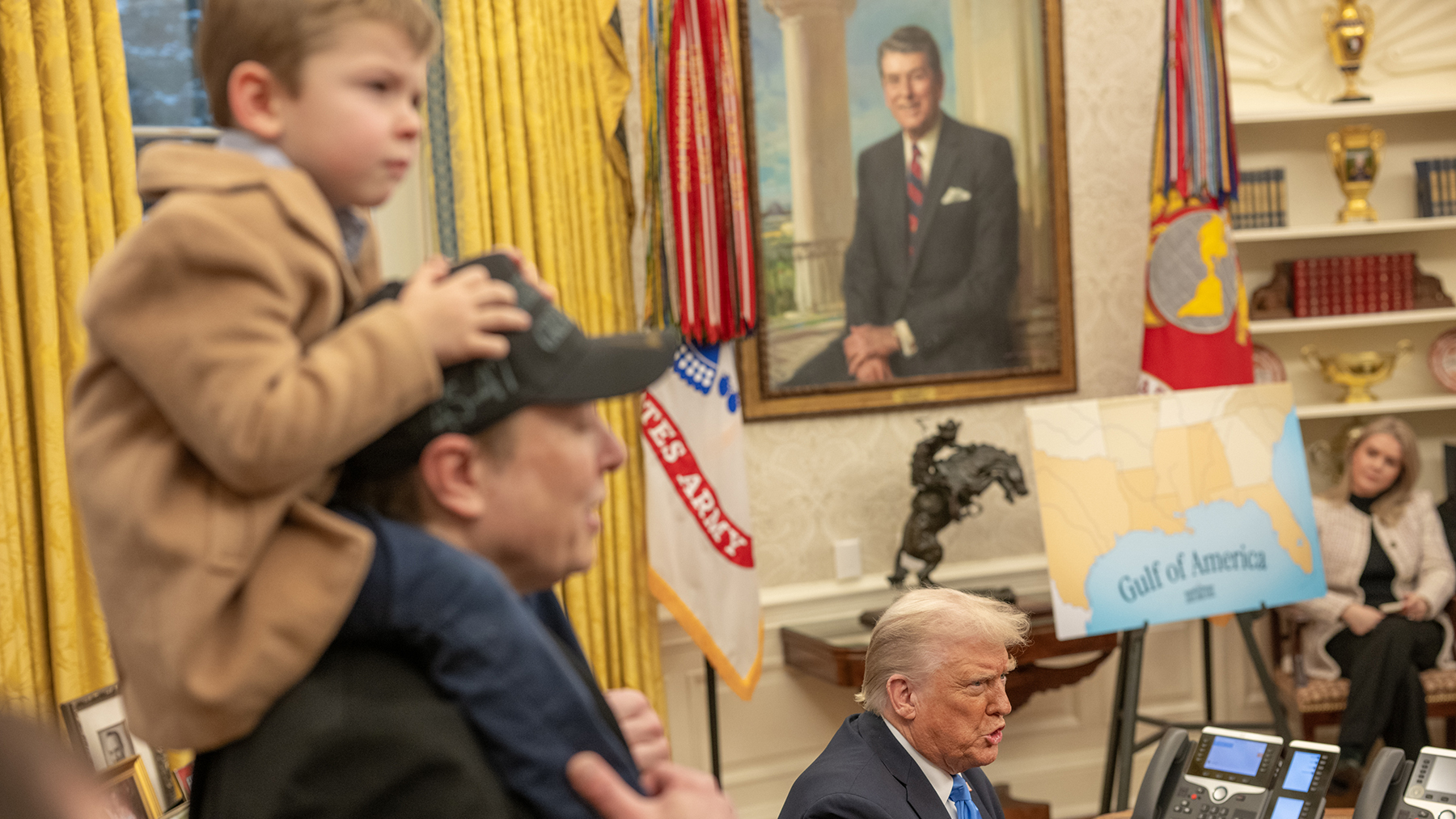 Above photo: Elon Musk attends a press conference in the Oval Office with his son. The White House.