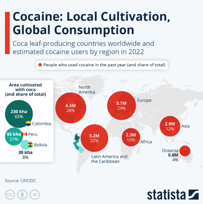 According to 2022 data from the United Nations Office on Drugs and Crime (UNODC), 65% of the cocaine in the world is produced in Colombia, which has historically been the closest US ally in Latin America and has been dominated by right-wing, pro-US politicians linked to cartels.