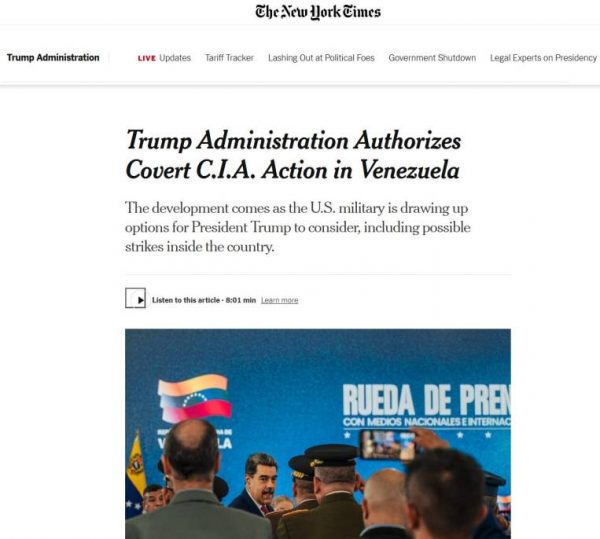 Trump has ordered the CIA “to carry out lethal operations in Venezuela”, the Times noted.