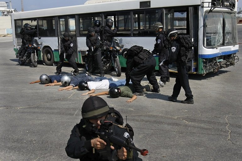 Above Photo: Members of an Israeli police SWAT team during a training exercise for U.S. police officials organized by the Anti-Defamation League. (AP/Bernat Armangue)