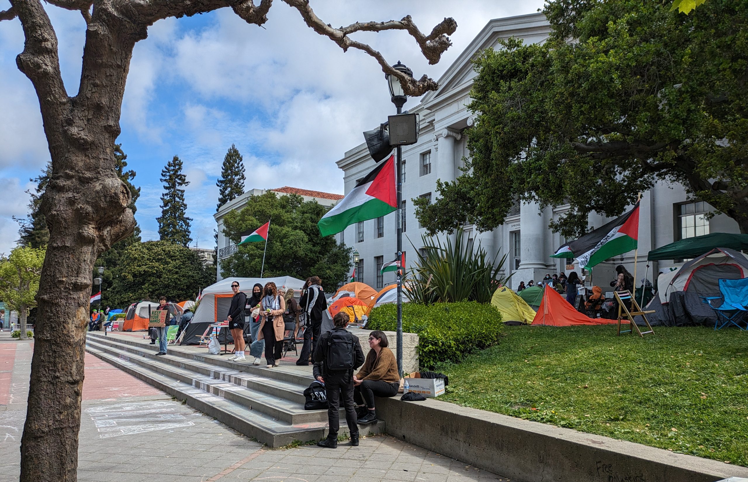 Above photo: Free Palestine encampment on the steps of Sproul Hall at the University of California, Berkeley, April 25, 2024. Wikimedia Commons.
