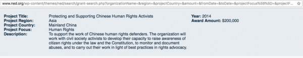 A search of the NED’s grants database shows funding from 2014 and 2015 totaling approximately half a million dollars to “support the work of Chinese human rights defenders.” It is not clear if this is a reference to the organization specifically, but the description accompanying the grants matches that of CHRD.