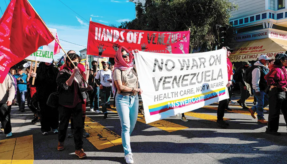 Above photo: Marchers protest during the San Francisco Fight Trump’s War on Venezuela in the Mission district of San Francisco on Saturday, January 10 2026. Yalonda M James/San Francisco Chronicle via AP.