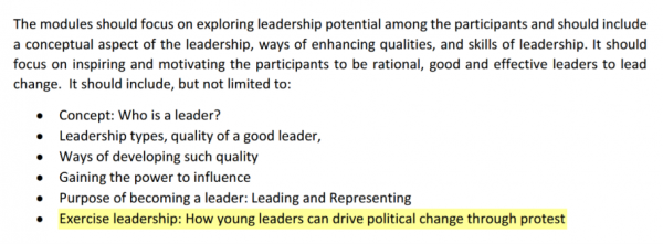 Workshop attendees were taught how youth activists had achieved “socio-economic and political changes” across the globe, and given tips on how to recreate those movements on a local level. Simultaneously, they were individually evaluated for “leadership potential,” and given tutorials focused on “inspiring and motivating the participants to be rational, good and effective leaders to lead change.” They were also encouraged to “exercise leadership,” with lessons on “how young leaders can drive political change through protest.”