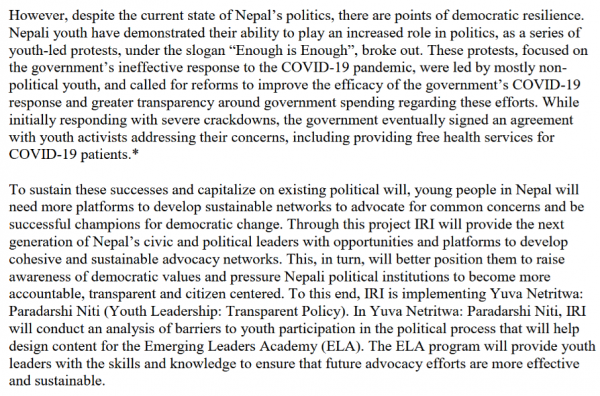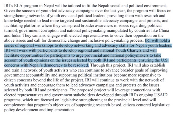 IRI undertook to “specifically solicit applications” to its Nepalese ELA “from young participants in a range of different sectors – including political parties, civil society and the media.” These “youth leaders” would be provided with “the skills and knowledge to ensure that future advocacy efforts and protests are effective and sustainable enough to encourage more people to engage” in US-approved political action, the report states.