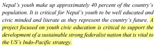 In August 2021, when seeking $500,000 for a local “youth civic education project,” the IRI cited internal research indicating 90% of young Nepalese were “disengaged with politics.” Because youth comprised 40% of the country’s population, it was therefore seen as critical to train future civic and political leaders who “support the development of a sustainable strong federalist nation that is vital to the US’s Indo-Pacific strategy.” IRI boasted of being “uniquely prepared to leverage its civil society and political contacts” to support this objective. It is unknown whether those funds were ultimately disbursed.