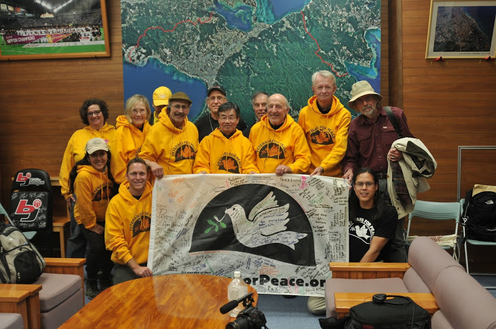 At 5:00 pm we arrived in Nago City to meet with Mayor Inamine who a few of us from VFP had met in Washington last year when Okinawan leaders traveled to DC to lobby against the Henoko runway project.  Mayor Inamine stood by a huge map of the city on his office wall and pointed out four areas where he is using his powers to block requests for base expansion operations.  He reported that 80% of the people in Okinawa are opposed to US bases and that he and the current Gov. Onaga were elected because of their opposition.  The mayor reported that Japan’s Prime Minister Shinzo Abe and Washington were trying to drown Okinawan citizens demands – it’s a classic power struggle which is now before Japan’s Supreme Court for resolution.  The question: Can Tokyo overrule local elected officials who are implementing the will of the people?