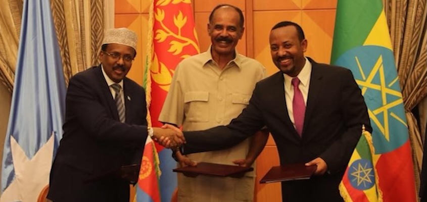 Above photo: Then Somali President Mohammed Abdullahi Mohammed, Eritrean President Isaias Afwerki, and Ethiopian Prime Minister Abiy Ahmed after signing a regional cooperation agreement in 2018.