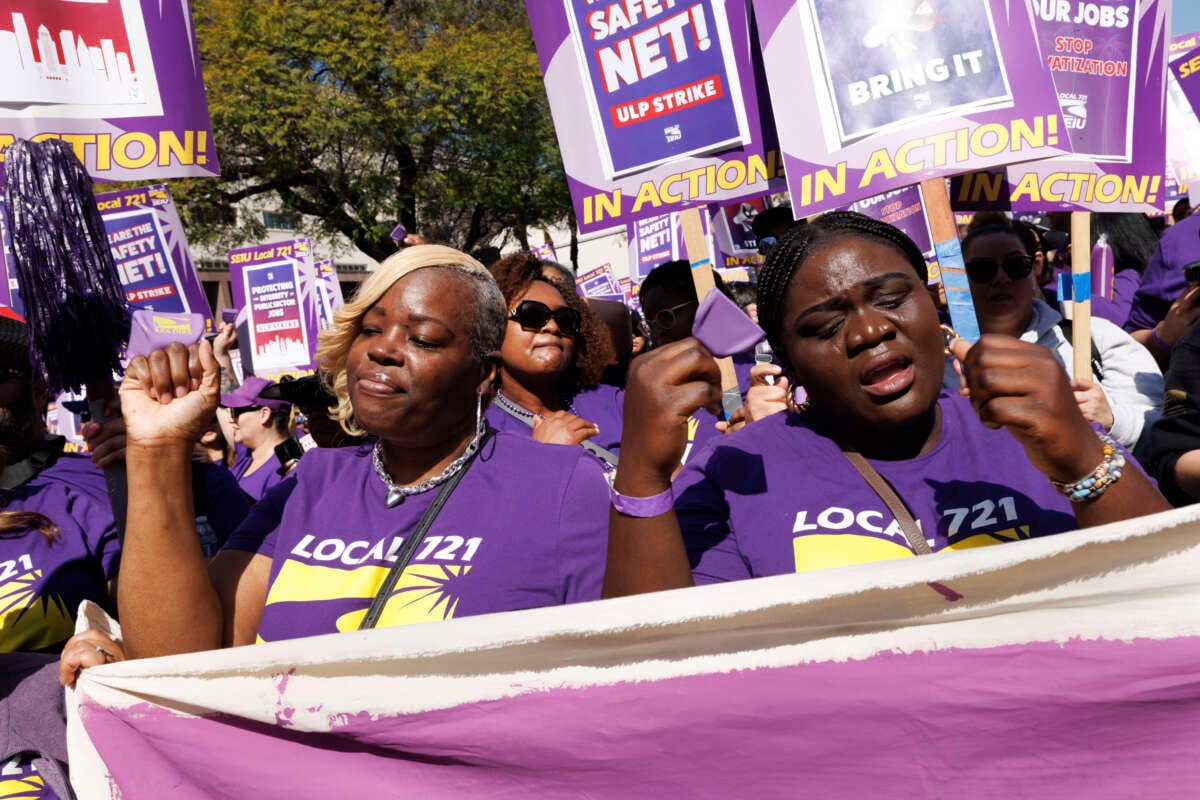 Above photo: Valencia Simpson (left) and Asiata Adekunle Murtala (right) rally with more than 55,000 members of SEIU Local 721 on strike on April 29, 2025, in Los Angeles, California. Carlin Stiehl / Los Angeles Times / Getty Images.