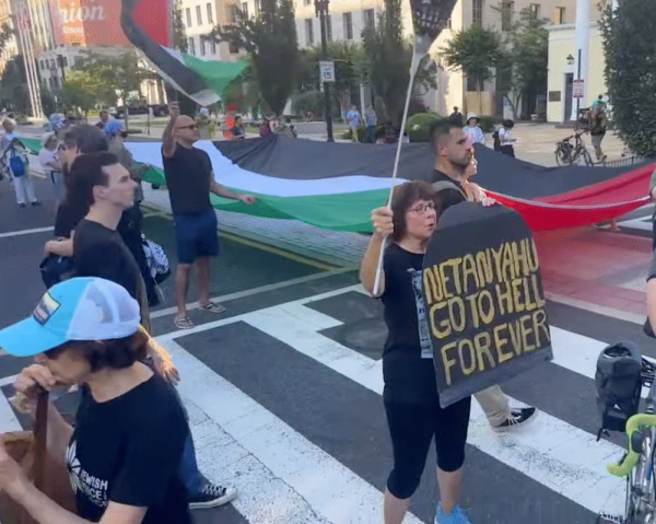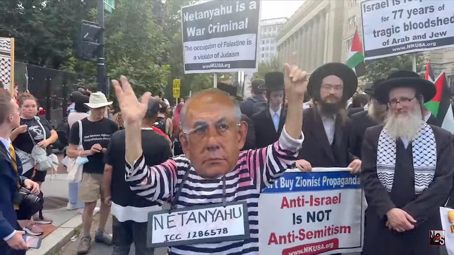 “Bibi, Bibi you can’t hide,” the protestors chanted. “You’ve been charged with genocide.” And: “Netanyahu you will see. Palestine will be free.”