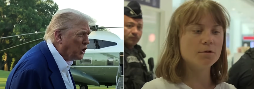 Above photo: (Left) Trump Angrily Saying “They Dont’t Know What the F**k they are doing.” (Right) AP Photo of Greta Thunberg upon arrival at Paris airport after kidnapping by Israeli military on Madleen of Gaza flotilla: “We Need More Angry Young Women.”