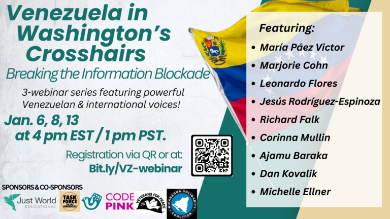 This was the first webinar in our timely series “Venezuela in Washington’s Crosshairs: Breaking the Information Blockade.” The speakers examined how U.S. policy targeted Venezuela and shaped public narratives about the country. The discussion focused on the illegality of Pres. Trump’s violent kidnapping of Pres. Nicolás Maduro and other U.S. policies like the debilitating sanctions, attacks on shipping, etc; and on regime change efforts, and the role of media silence and distortion.
