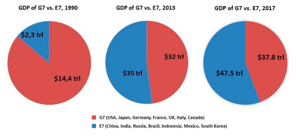 In a report of 2014, we compared the G7 countries with a group we arbitrary called Emerging 7, consisting of the then seven biggest non-G7 countries: China, India, Russia, Brazil, Indonesia, Mexico, South Korea (on 2017 data, Turkey would be bigger than South Korea). We do not strive to imply that the E7 would form a political or economic block, rather we have grouped them together only to illustrate the fall of the economic might of the G7. (However, through BRICS, G20 and other forms of cooperation most of the emerging economic powers are in some kind of cooperation, which is not to the liking of the Ancien Régime).