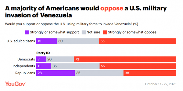 Polls show that Trump’s war on Venezuela is very unpopular inside the US. A slight majority of Americans, 55%, would oppose a US invasion of Venezuela; whereas only 15% would support it. A clear plurality, 45%, oppose using the US military to overthrow President Maduro; while just 18% support this. However, public opposition has never stopped Washington before.